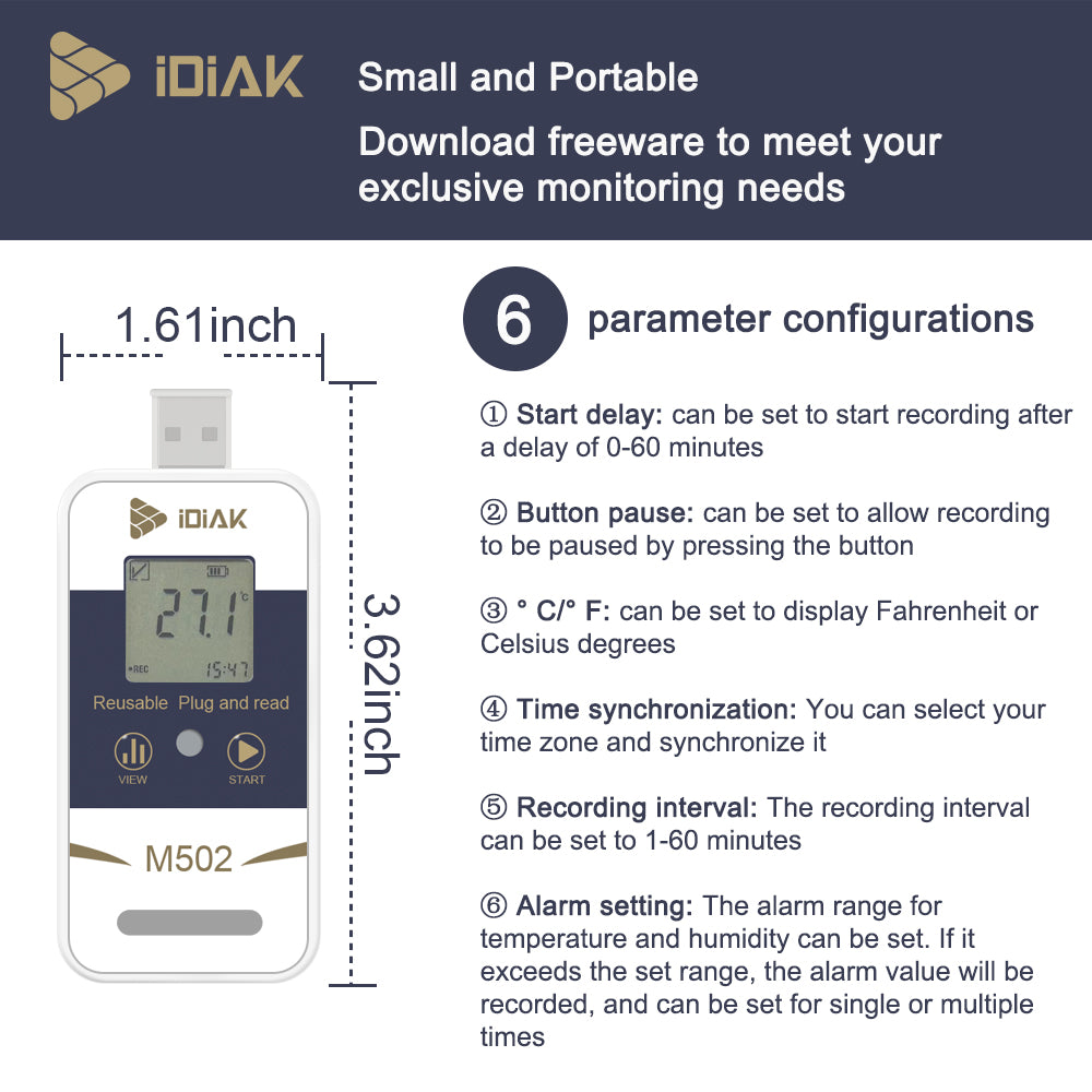 IDIAK M502 USB Temperature Data Logger Temp/Humidity Recorder with PDF and Excel (Reusable) Refrigerator Thermometer 14400 Points High Accuracy - 1 Pack